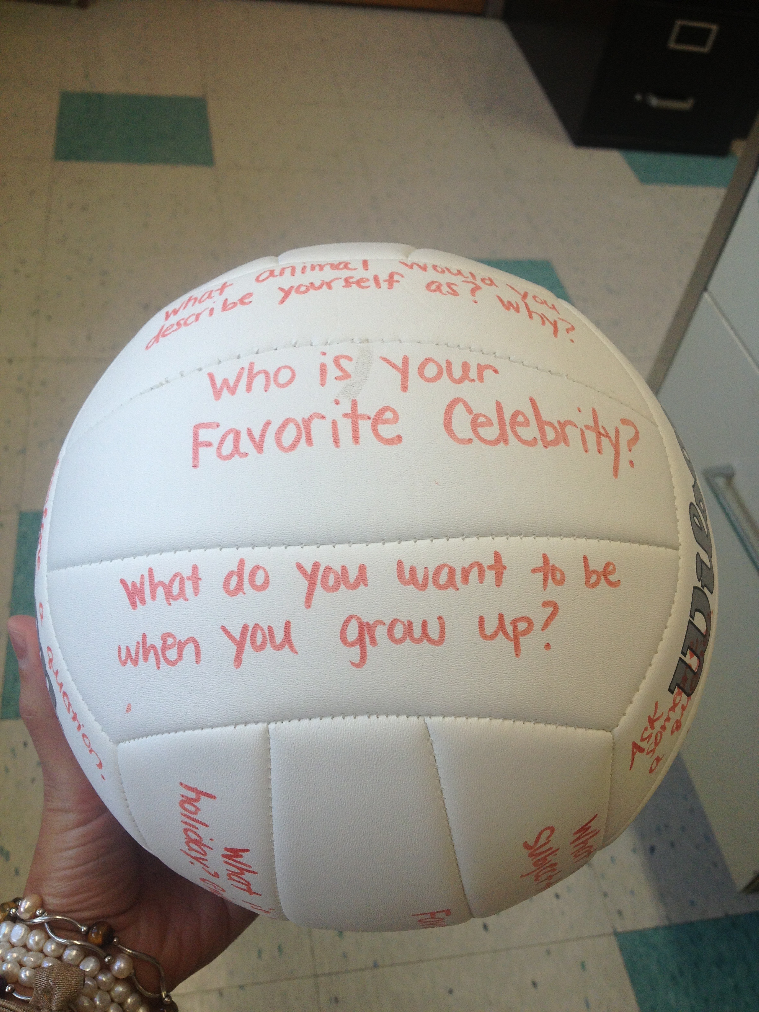 Below is my creation of a “Throw and Talk” ball that I found on the site. I covered a white volleyball (4 dollars at Walgreens) with various personal opinion questions, most of which required more than a one word answer. (You can always ask for explanations, which will help students to expand upon their thoughts).