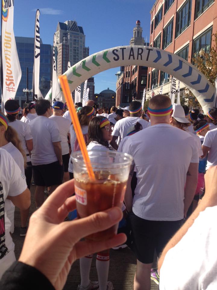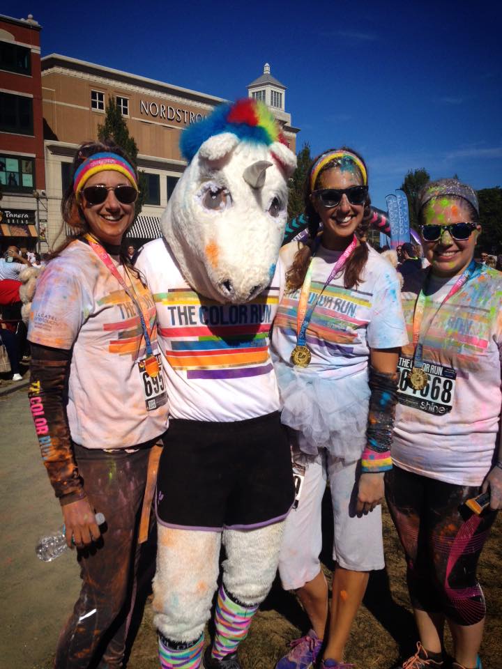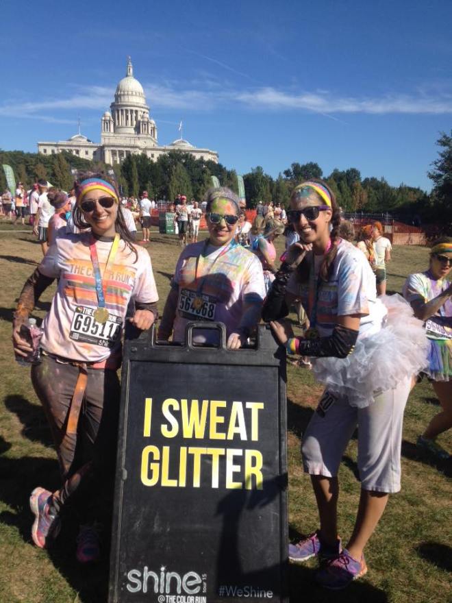 Today I had to wake up super early for The Color Run Providence. My sister and I ran this last year, but it was our friend Kim’s first time. This is the kind of 5k that you don’t want to sprint through, there is no need. It’s a fun one to jog slowly, and enjoy. You pass through five “color stations,” where you are doused with a color. New this year, they added a “Shine” station where you are covered in glitter! (Which I haven’t been able to wash off yet, by the way, haha). It really is the happiest 5k–There are bubbles, and unicorns, and colors! It was also a sunshiney day, which always makes things even better. π