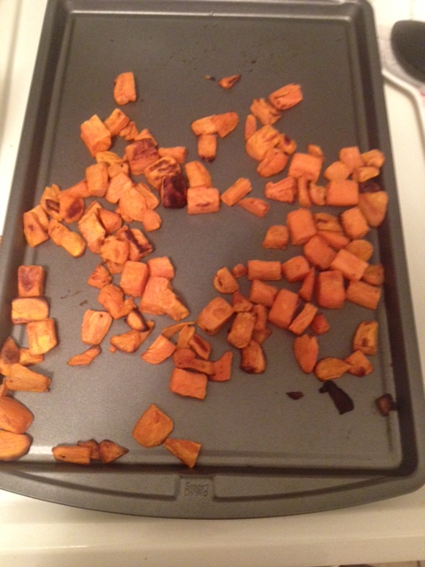 To assemble this little concoction, you must first line a baking sheet with 1 tbsp of olive oil. Place sweet potatoes on pan and stir around so they are coated with oil. Then roast the archer farms sweet potatoes in a 425 degree oven for 25 minutes, turning every 7 minutes or so.