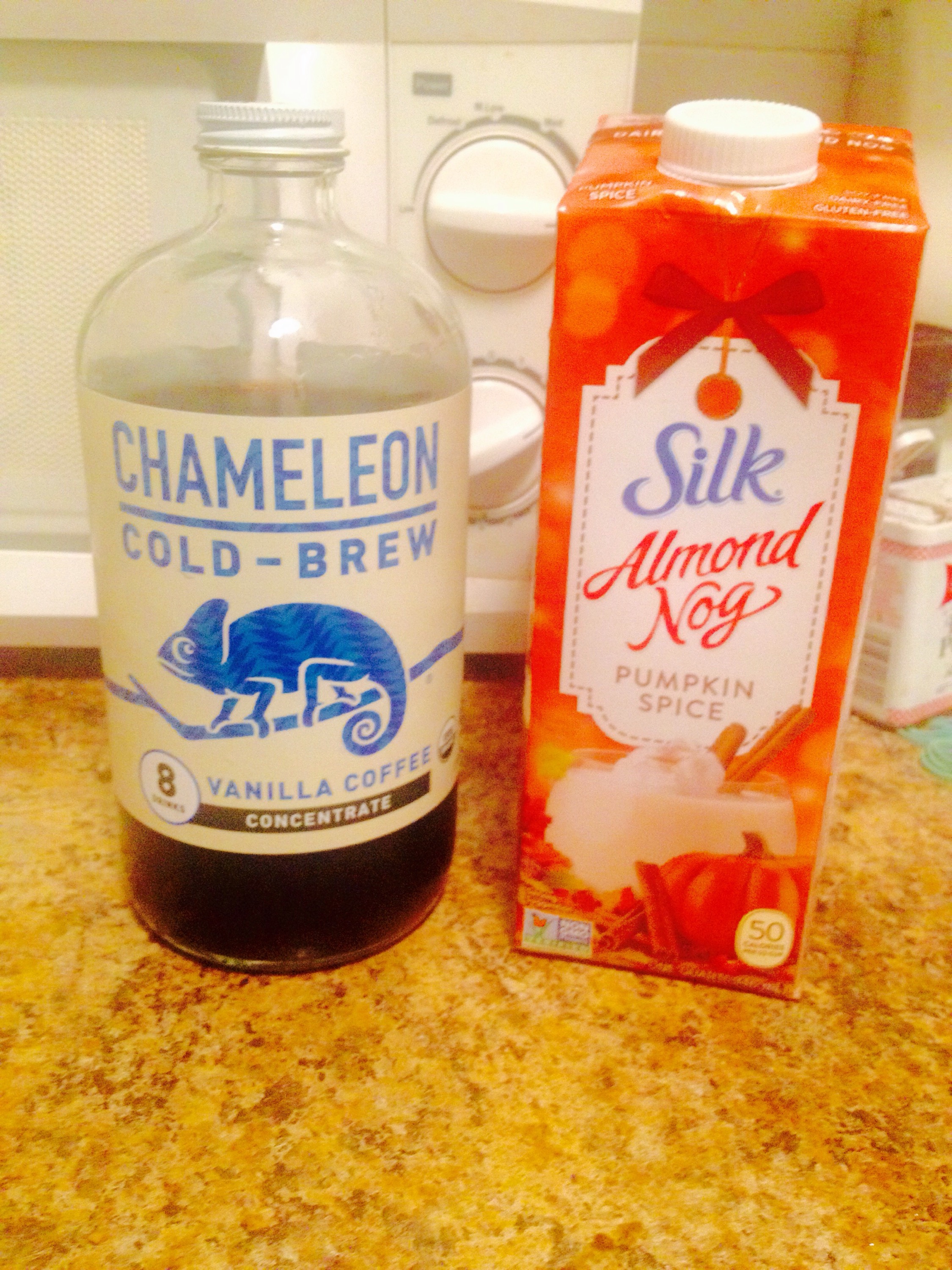 I also bought Silk Almond Nog in Pumpkin Spice! Cold brew can be enjoyed hot or cold. For my morning beverage, I’ve been adding ice to my cute pumpkin mason jar, then filling it up halfway with cold brew. The other half is a mixture of water and the pumpkin spice nog. So good!