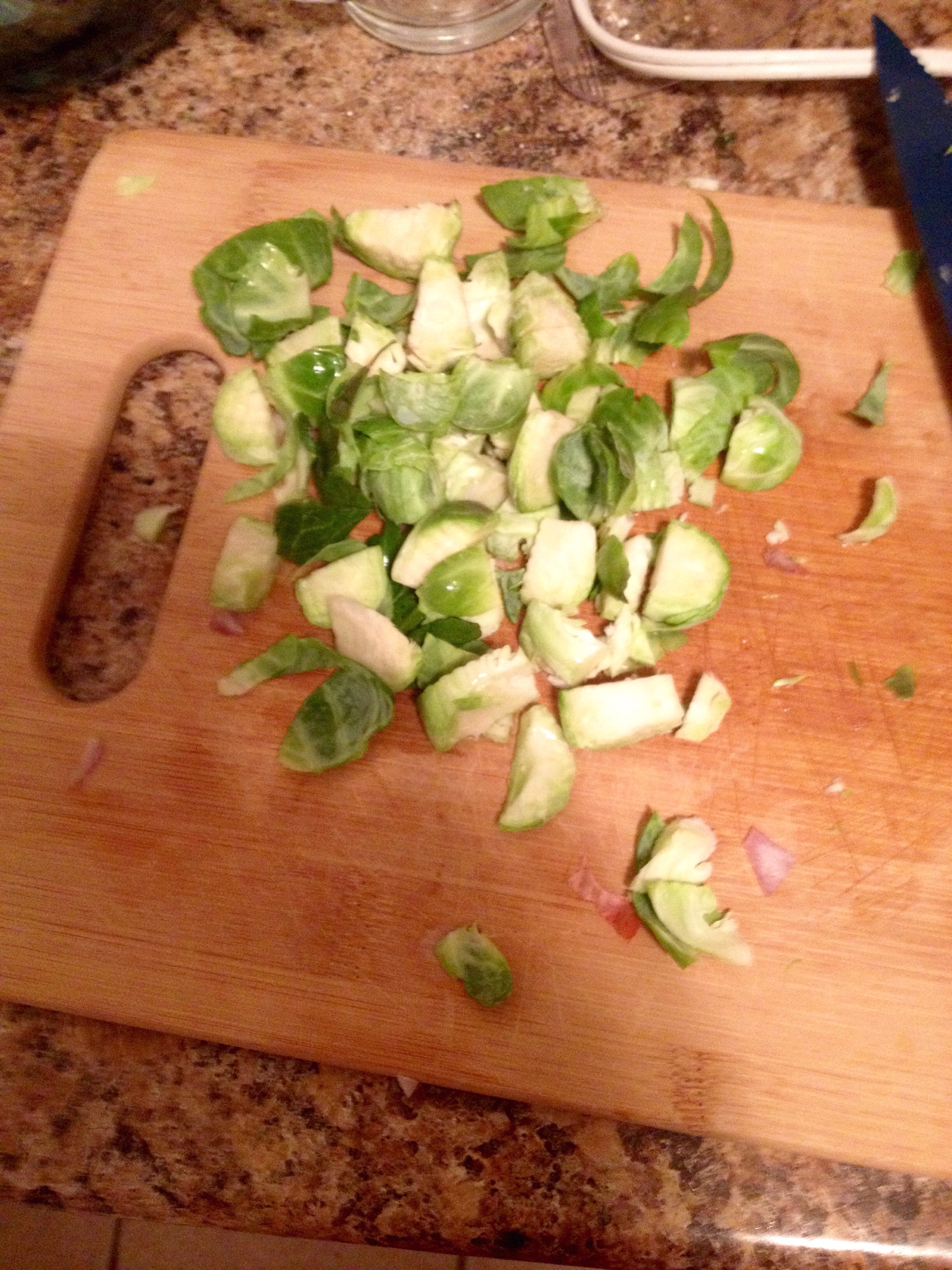 - While pasta is cooking, cut brussels sprouts into thin slices,