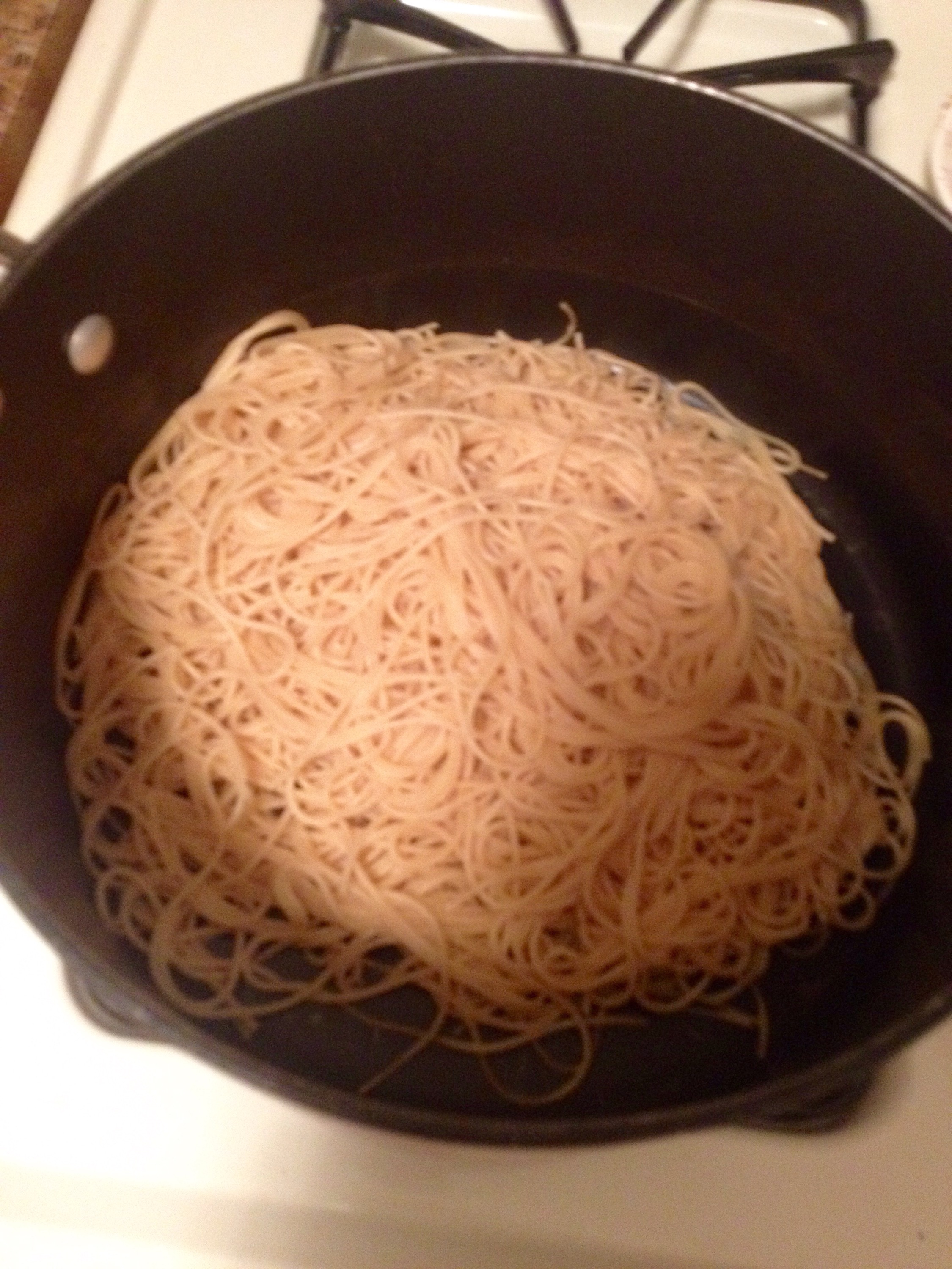 - Cook pasta in salted water, according to directions in package. Before draining, save 1/2 cup of pasta stock in a separate cup.