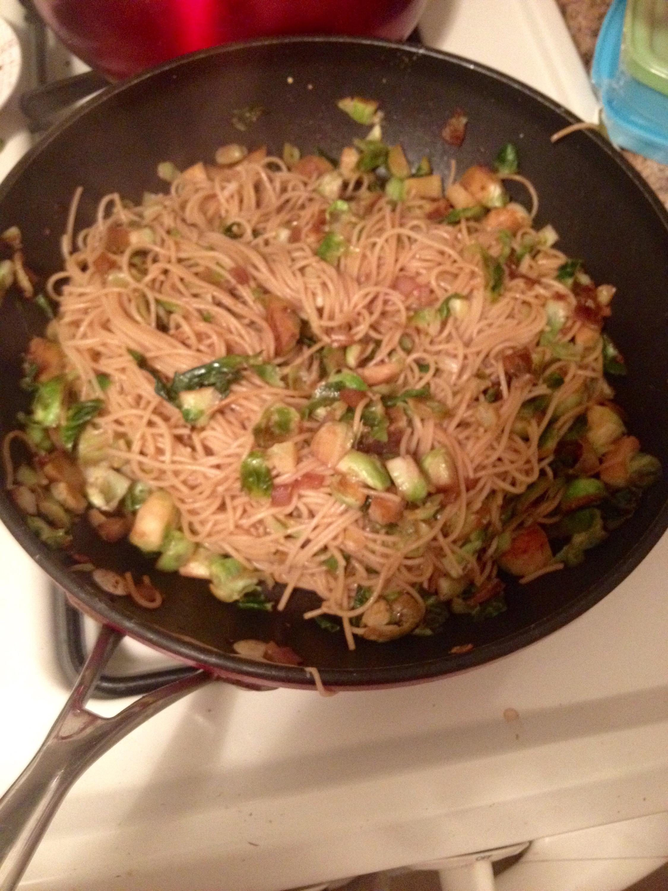 I’ve literally been living off of this meal for a few weeks now, I just can’t get enough. It’s the perfect Fall comfort food with the hearty pasta and crisp Brussels Sprouts. Unfortunately, Brussels Sprouts have been banned from my sister’s house and my parent’s house due to their slightly unpleasant odor, but when I’m in the comfort of my own home, I dig right in (and I light a few candles after).